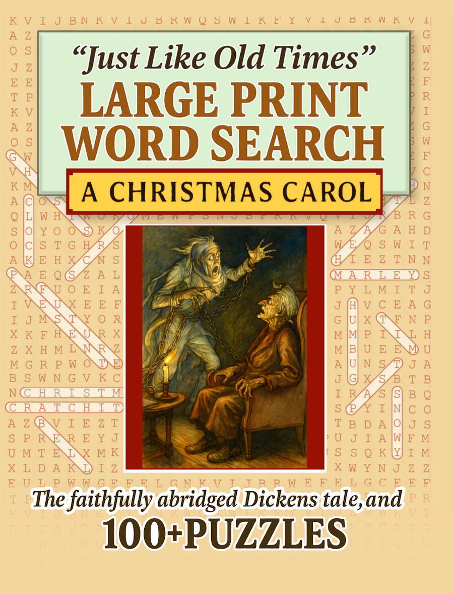 A new kind of Christmas traditionThis large-print word search edition of A Christmas Carol gathers vivid phrases, wintry scenes, and memorable moments drawn directly from Dickens’s 1843 classic—including the very lines he used in his famed public readings.Each puzzle reveals a moment from Scrooge’s Christmas Eve haunting: candlelit chambers, foggy lanes, ghostly chains, and the Spirits who guide him toward redemption. Clear grids, readable type, and restored historical notes make this a wonderfully heartwarming holiday companion.• A cozy holiday keepsake you’ll want on your shelf long after the puzzles are solved• 100+ festive, large-print word search puzzles inspired by Dickens’s dramatic structure• Large print for relaxed, comfortable solving• Select reproductions of Dickens’s manuscript notes, Pitman shorthand pages, and other archival curiosities• A wonderful holiday gift for seniors, families, book clubs, or anyone who loves Christmas classicsWarm, nostalgic, and spirited in all the right ways—this book brings Dickens’s beloved tale to life through a relaxing holiday activity that readers of all ages can enjoy.Available now on Amazon.